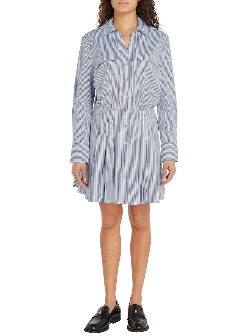 - bumbac Imprimeu: dungi Croiala: evazat Lungime: scurta Guler: ascutit Lungime maneca: maneca lunga Sistem inchidere: nasturi Compozitie Exterior: 69% bumbac
