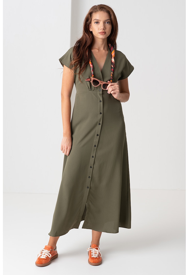 Caracteristici Culoare: verde masliniu Stil: casual Material: sintetic Imprimeu: uni Croiala: dreapta Lungime: lunga Decolteu: in v Lungime maneca: maneca scurta Sistem inchidere: nasturi Compozitie Exterior: 50% poliester reciclat