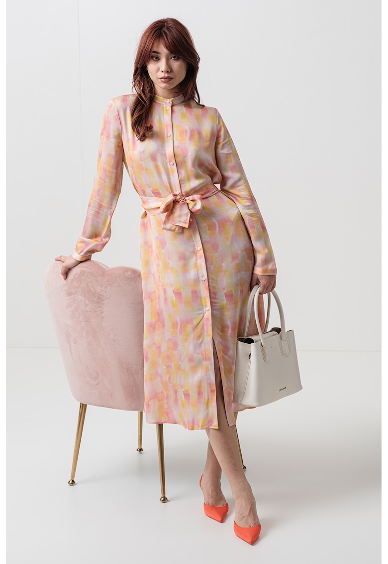 - roz pal Stil: casual Material: viscoza Imprimeu: abstract Croiala: evazat Lungime: midi Decolteu: mao Lungime maneca: maneca lunga Sistem inchidere: nasturi