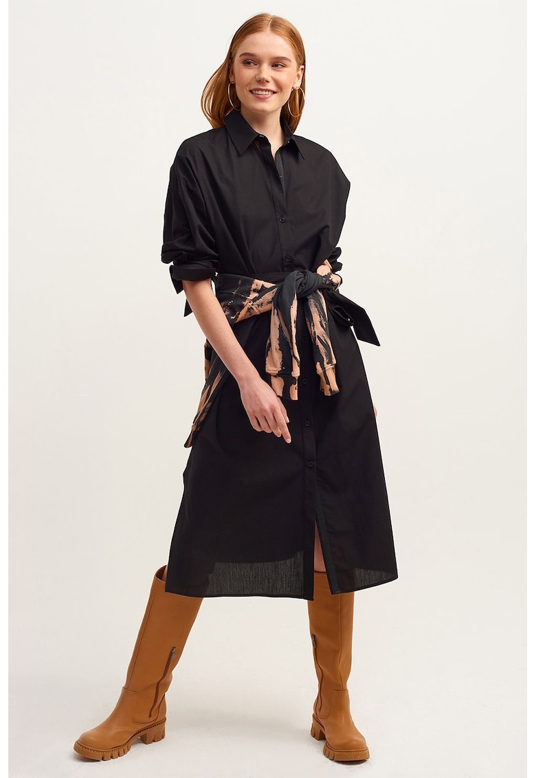Caracteristici Culoare: negru Stil: casual Material: bumbac Imprimeu: uni Croiala: evazat Lungime: midi Guler: clasic Maneci: cu mansete Lungime maneca: maneca lunga Detalii: slituri laterale