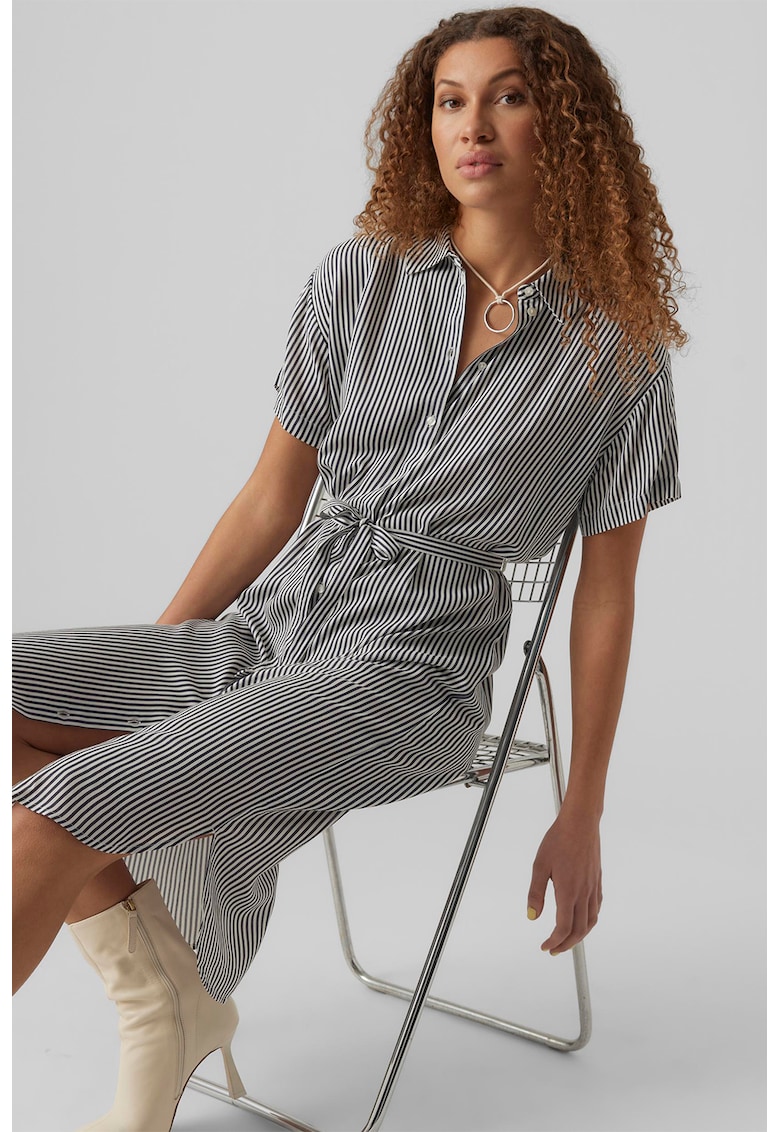 - negru Stil: casual Material: viscoza Imprimeu: dungi Croiala: dreapta Lungime: midi Guler: ascutit Lungime maneca: maneca scurta Talie: talie prevazuta cu snur Sistem inchidere: nasturi Compozitie Exterior: 100% viscoza