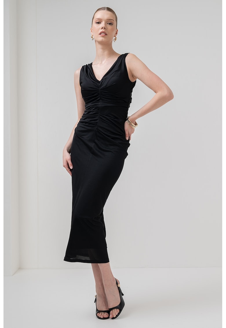 - viscoza Imprimeu: uni Croiala: cambrata Lungime: midi Decolteu: in v Lungime maneca: fara maneca Sistem inchidere: fara inchidere Compozitie Exterior: 58% viscoza