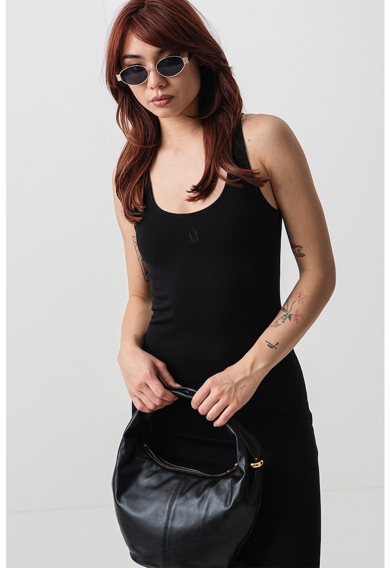 - viscoza Imprimeu: uni Croiala: cambrata Lungime: midi Decolteu: amplu Lungime maneca: fara maneca Sistem inchidere: fara inchidere Compozitie Exterior: 66% viscoza