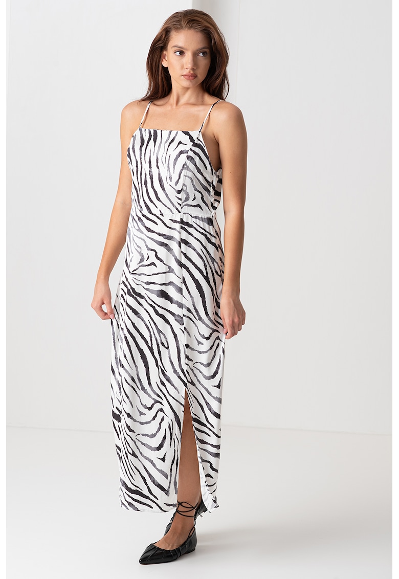 - alb optic Stil: casual Material: viscoza Imprimeu: animal print Croiala: dreapta Lungime: lunga Decolteu: patrat Barete: ajustabile Lungime maneca: fara maneca Detalii: slit pe partea din fata Sistem inchidere: fermoar Compozitie Exterior: 50% viscoza