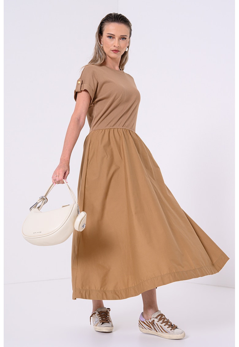 Caracteristici Culoare: caramel Stil: casual Material: bumbac organic Imprimeu: uni Croiala: in a Lungime: midi Decolteu: rotund Lungime maneca: maneca scurta Buzunare: buzunare laterale Compozitie Exterior: 97% bumbac organic