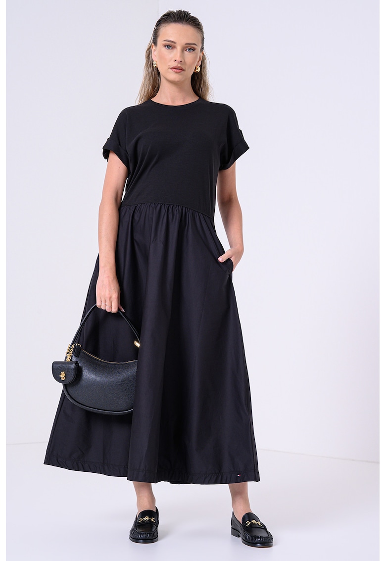 Caracteristici Culoare: negru Stil: casual Material: bumbac organic Imprimeu: uni Croiala: in a Lungime: midi Decolteu: rotund Lungime maneca: maneca scurta Buzunare: buzunare laterale Compozitie Exterior: 97% bumbac