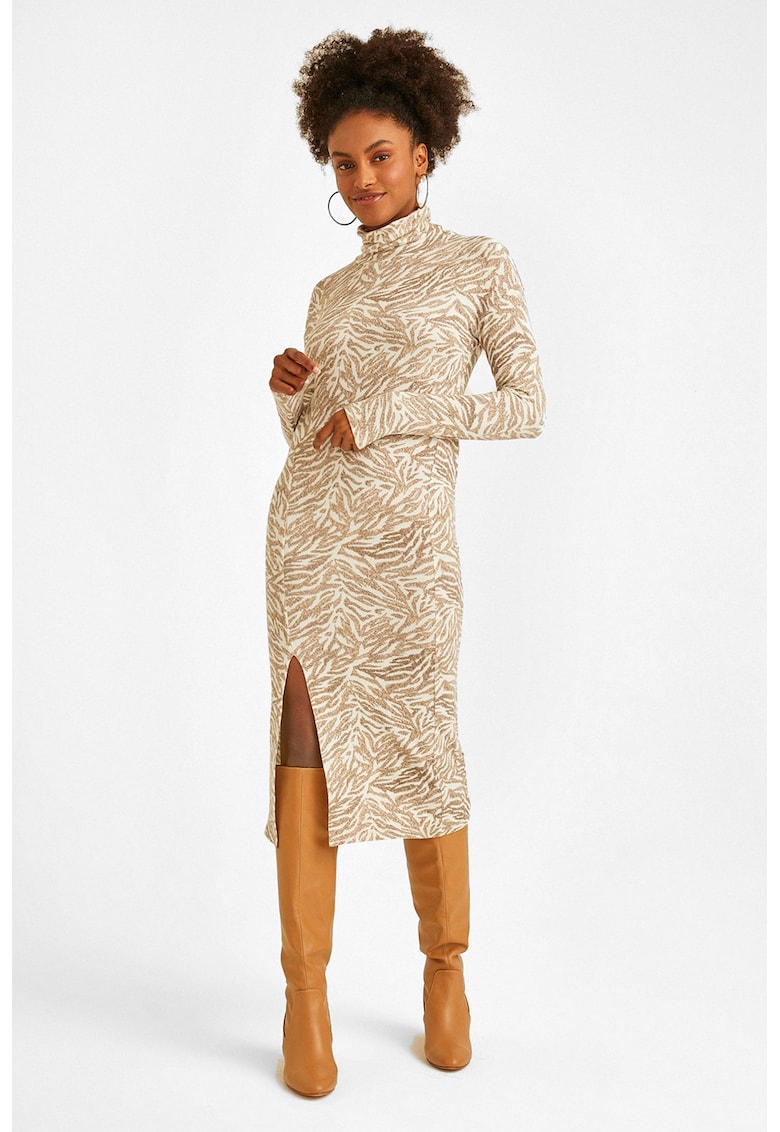 - maro nisip Stil: casual Material: viscoza Imprimeu: animal print Croiala: bodycon Lungime: midi Guler: inalt Lungime maneca: maneca lunga Detalii: slit pe partea din fata Sistem inchidere: fara inchidere Compozitie Exterior: 95% viscoza