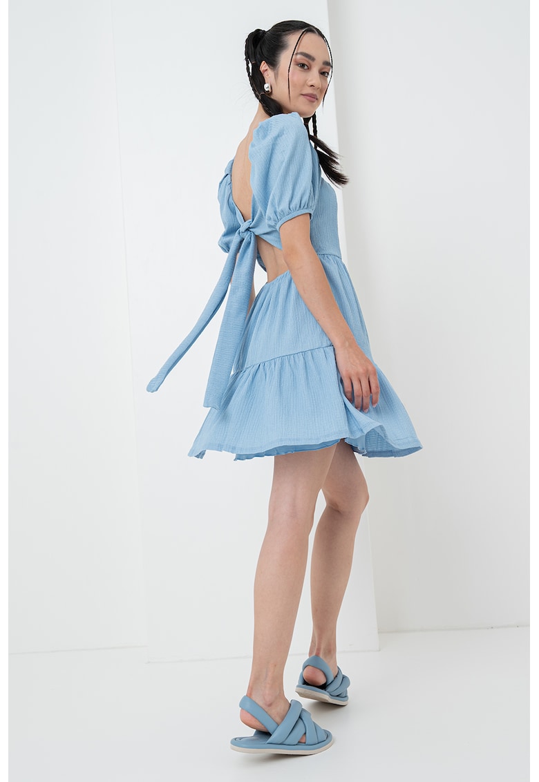 Caracteristici Culoare: albastru azur Stil: casual Material: poliester Imprimeu: uni Croiala: in a Lungime: scurta Decolteu: patrat Lungime maneca: maneca scurta Detalii: cordon pe partea din spate Compozitie Exterior: 98% poliester reciclat