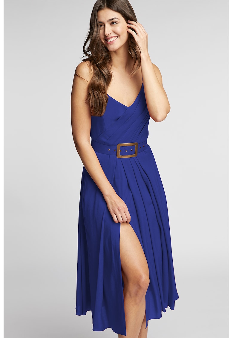 - in Imprimeu: uni Croiala: evazat Lungime: midi Decolteu: in v Barete: ajustabile Lungime maneca: fara maneca Talie: curea Detalii: fronseuri