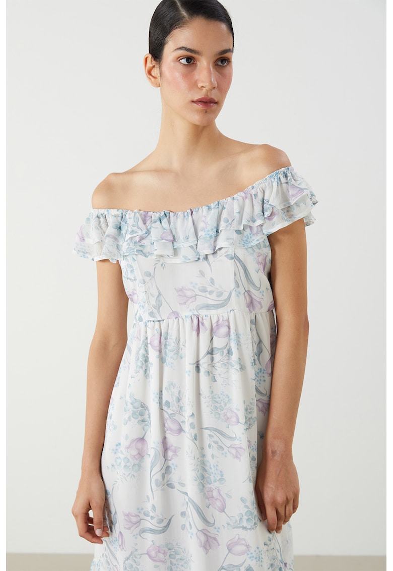 - alb murdar Stil: casual Material: sintetic Imprimeu: floral Croiala: evazat Lungime: midi Decolteu: drept Lungime maneca: maneca scurta Sistem inchidere: fara inchidere Compozitie Exterior: 100% poliester Captuseala: 100% poliester