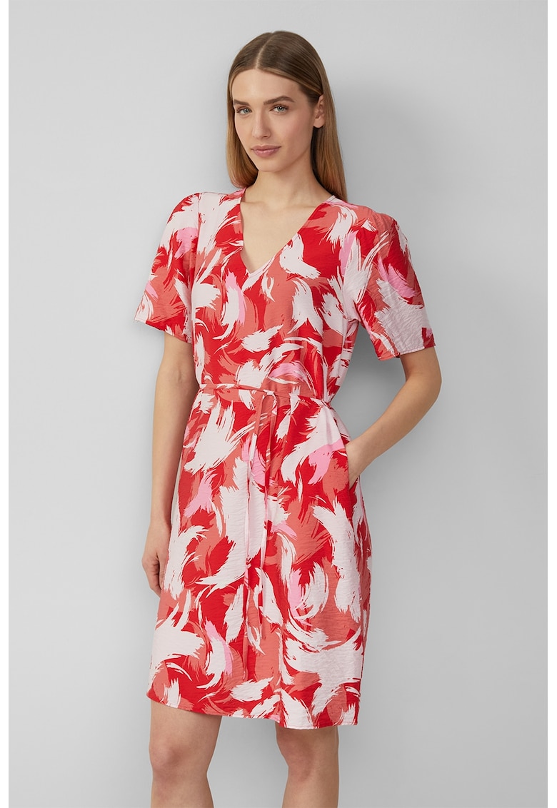 - viscoza Imprimeu: abstract Croiala: dreapta Lungime: scurta Decolteu: in v Lungime maneca: maneca scurta Buzunare: in cusaturile laterale Detalii: cordon asortat Sistem inchidere: fara inchidere Compozitie Exterior: 84% viscoza