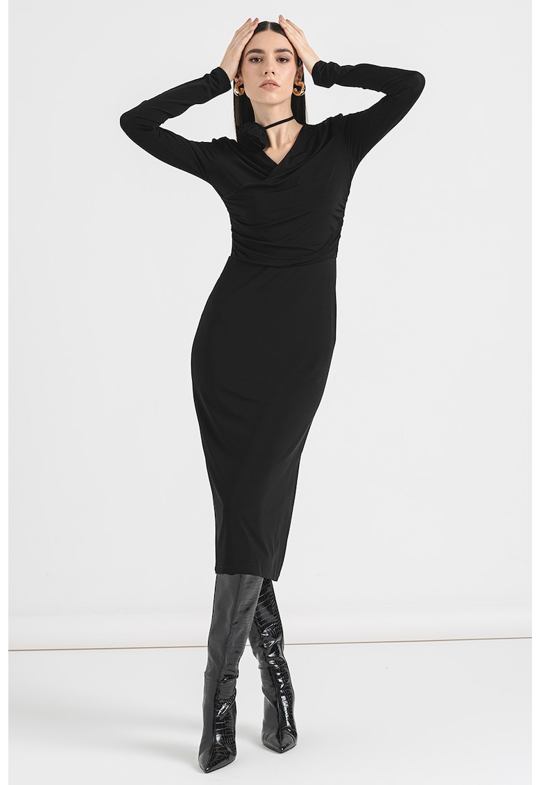 Caracteristici Culoare: negru Stil: elegant Material: viscoza Imprimeu: uni Croiala: dreapta Lungime: lunga Decolteu: in v Lungime maneca: maneca lunga Compozitie Exterior: 88% viscoza