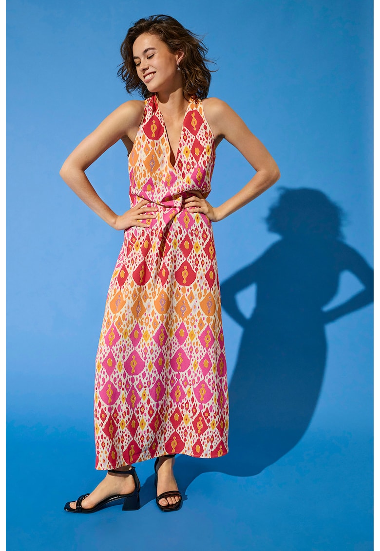 - roz Stil: casual Material: poliester Imprimeu: abstract Croiala: lejer Lungime: lunga Decolteu: in v Lungime maneca: fara maneca Sistem inchidere: fara inchidere Compozitie Exterior: 97% poliester