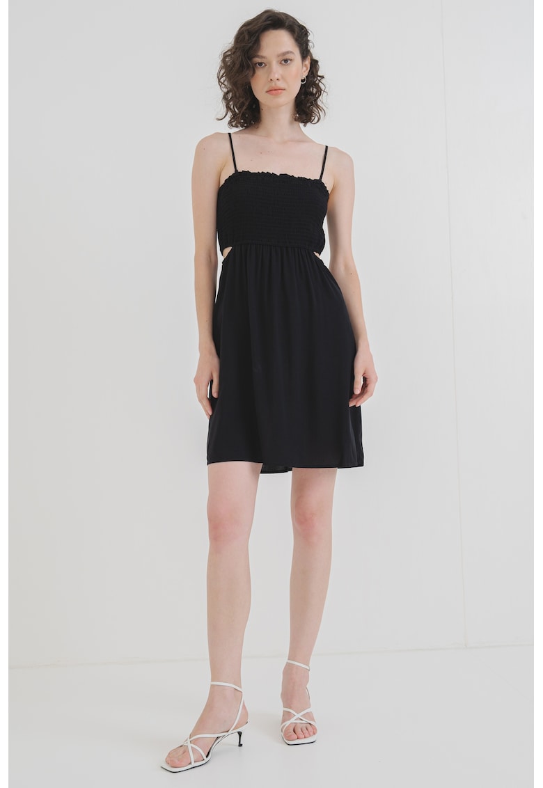 Caracteristici Culoare: negru Stil: casual Material: viscoza Imprimeu: uni Croiala: evazat Lungime: scurta Decolteu: patrat Lungime maneca: fara maneca Detalii: insertie elastica in partea superioara