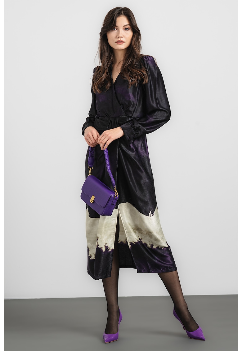 - violet Stil: elegant Material: poliester Imprimeu: abstract Croiala: petrecuta Lungime: lunga Decolteu: in v Lungime maneca: maneca lunga Compozitie Exterior: 100% poliester Captuseala: 100% poliester Info model Modelul poarta un produs de marimea S. Marimi model: 176 cm inaltime