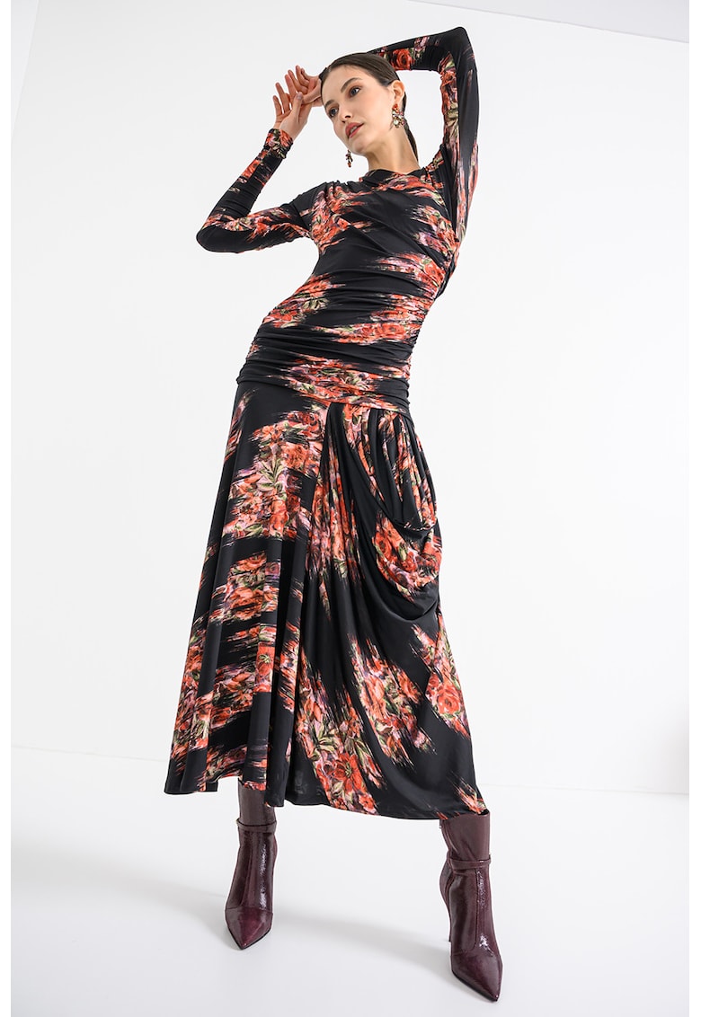 - rosu vermillion Stil: casual Material: viscoza Imprimeu: floral Croiala: evazat Lungime: lunga Decolteu: cache-coeur Lungime maneca: maneca lunga Detalii: fronseuri Sistem inchidere: fara inchidere Compozitie Exterior: 95% viscoza