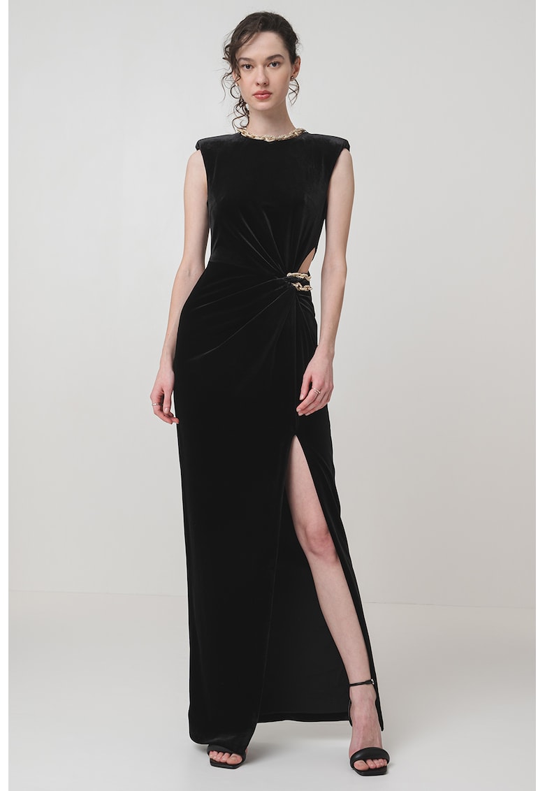 Caracteristici Culoare: negru Stil: elegant Material: poliester Imprimeu: uni Croiala: cambrata Lungime: lunga Decolteu: decolteu la baza gatului Lungime maneca: fara maneca Sistem inchidere: fermoar Compozitie Exterior: 92% poliester
