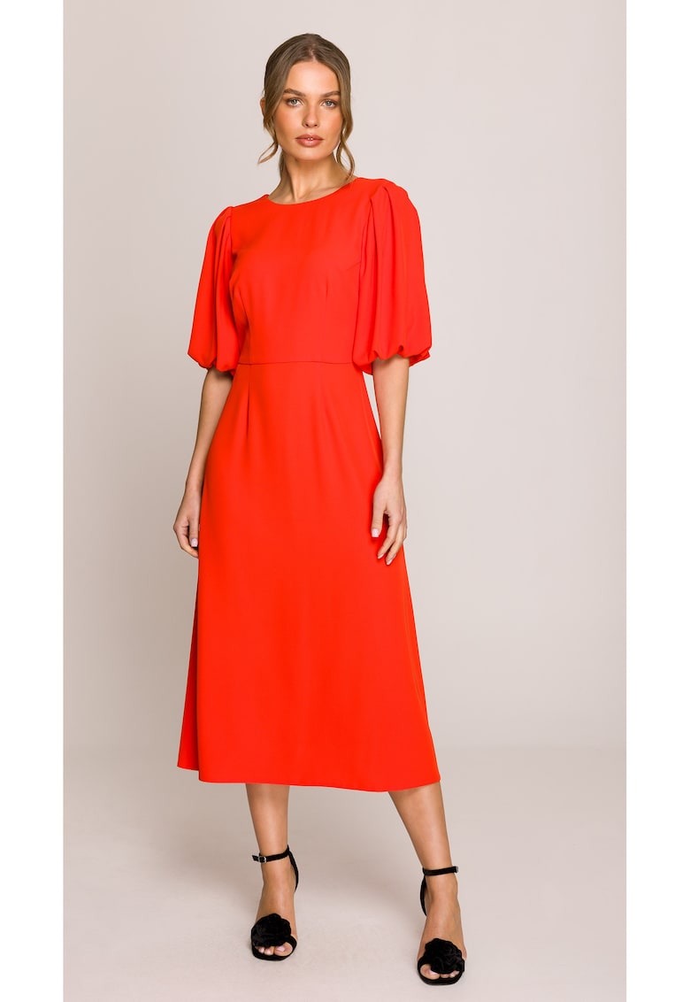 - elastan Imprimeu: uni Croiala: evazat Lungime: midi Decolteu: rotund Lungime maneca: maneca medie Detalii: produs in europa Compozitie Exterior: 95% poliester