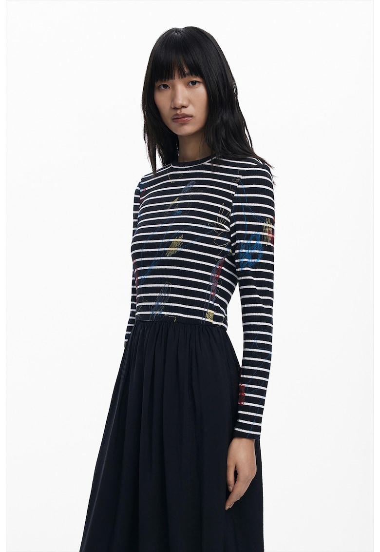 - viscoza Imprimeu: dungi Croiala: in a Lungime: midi Decolteu: decolteu la baza gatului Lungime maneca: maneca lunga Compozitie Exterior: 56% viscoza