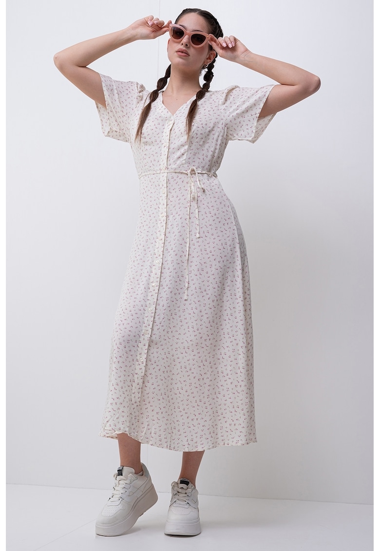 - crem Stil: casual Material: viscoza Imprimeu: floral Croiala: evazat Lungime: midi Decolteu: in v Maneci: fluture Lungime maneca: maneca scurta Detalii: cordon asortat Sistem inchidere: nasturi Compozitie Exterior: 100% viscoza lenzing™ecovero™ Info model Modelul poarta un produs de marimea S. Marimi model: 176 cm inaltime