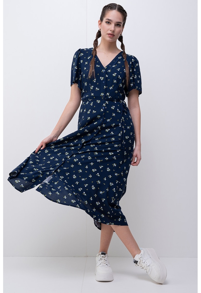 - bleumarin Stil: casual Material: viscoza Imprimeu: floral Croiala: evazat Lungime: midi Decolteu: in v Maneci: fluture Lungime maneca: maneca scurta Detalii: cordon asortat Sistem inchidere: nasturi Compozitie Exterior: 100% viscoza lenzing™ecovero™ Info model Modelul poarta un produs de marimea S. Marimi model: 176 cm inaltime