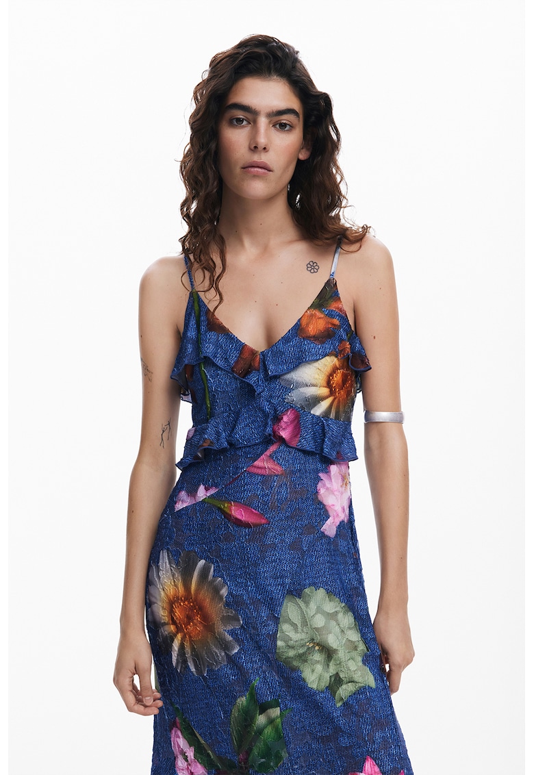 Caracteristici Culoare: multicolor Stil: elegant Material: poliester Imprimeu: floral Croiala: dreapta Lungime: lunga Decolteu: in v Barete: inguste Lungime maneca: fara maneca Detalii: terminatie asimetrica