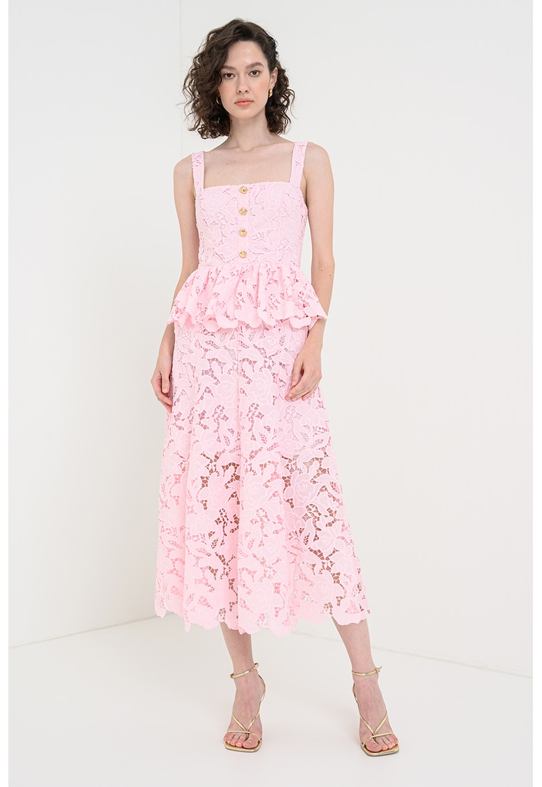 Caracteristici Culoare: roz pastel Stil: casual Material: poliester Imprimeu: floral Croiala: evazat Lungime: midi Decolteu: patrat Lungime maneca: fara maneca Buzunare: 2 laterale Compozitie Exterior: 100% poliester Info model Modelul poarta un produs de marimea S/8 UK. Marimi model: 177 cm inaltime