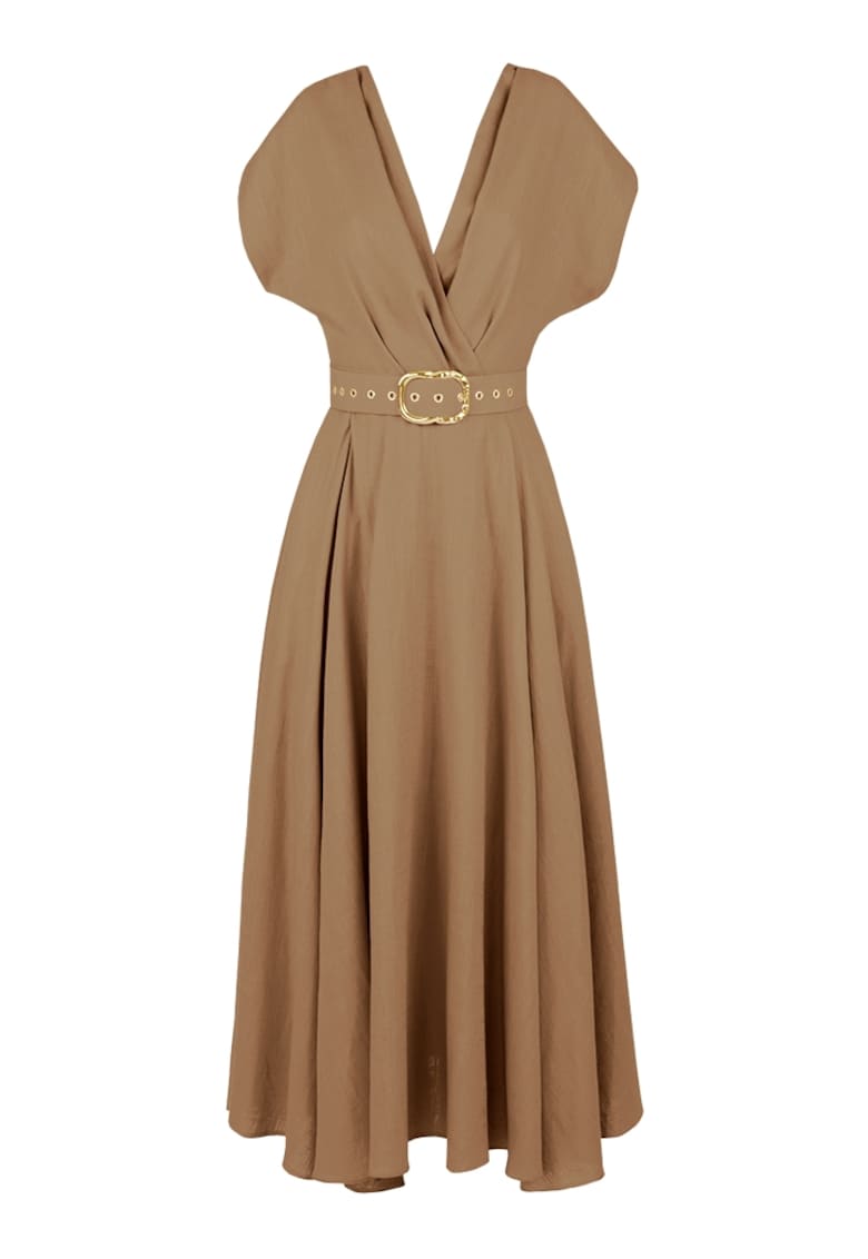 Caracteristici Culoare: bej inchis Stil: casual Material: rayon Imprimeu: uni Croiala: evazat Lungime: midi Decolteu: cache-coeur Lungime maneca: fara maneca Talie: cu o curea din material textil Buzunare: 2 laterale Detalii: curea in talie Sistem inchidere: fermoar Compozitie Exterior: rayon Captuseala: 75% raion