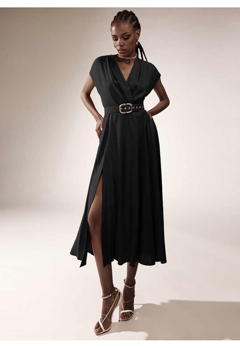 Caracteristici Culoare: negru Stil: casual Material: in Imprimeu: uni Croiala: evazat Lungime: midi Decolteu: cache-coeur Lungime maneca: fara maneca Talie: cu o curea din material textil Buzunare: 2 laterale Detalii: curea in talie Sistem inchidere: fermoar Compozitie Exterior: 75% raion