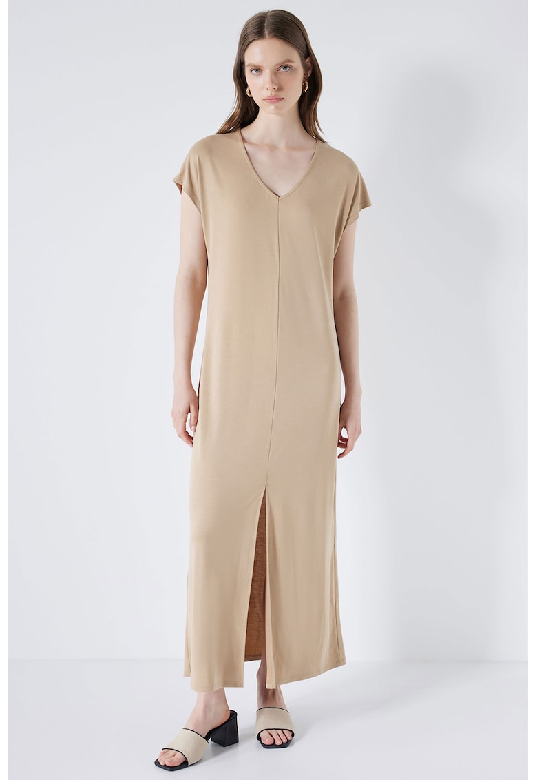 - modal Imprimeu: uni Croiala: dreapta Lungime: lunga Decolteu: in v Lungime maneca: maneca scurta Detalii: slit pe partea din fata Sistem inchidere: fara inchidere Compozitie Exterior: 77% modal