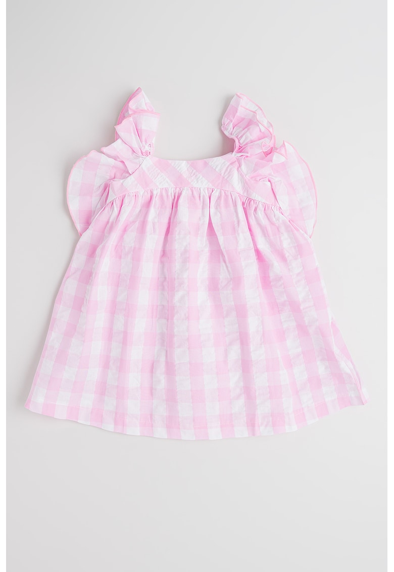 - roz pal Stil: casual Material: bumbac Imprimeu: carouri Croiala: in a Lungime maneca: fara maneca Stil decolteu: patrat Sistem inchidere: nasturi Detalii: volane Colectie: primavara