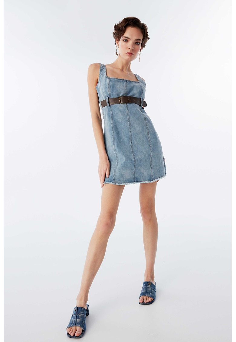 Caracteristici Culoare: albastru deschis Stil: casual Material: denim Imprimeu: uni Croiala: evazat Lungime: scurta Decolteu: patrat Lungime maneca: fara maneca Sistem inchidere: fara inchidere Compozitie Exterior: 70% bumbac