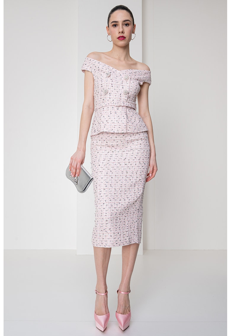 - roz pastel Stil: elegant Material: poliester Imprimeu: uni Croiala: decolteu pe umeri Lungime: midi Lungime maneca: maneca scurta Compozitie Exterior: 98% poliester