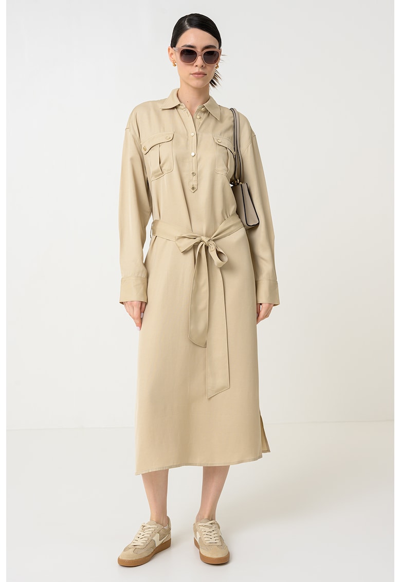 Caracteristici Culoare: maro nisip Stil: casual Material: viscoza Imprimeu: uni Croiala: dreapta Lungime: lunga Guler: clasic Lungime maneca: maneca lunga Compozitie Exterior: 98% vascoza