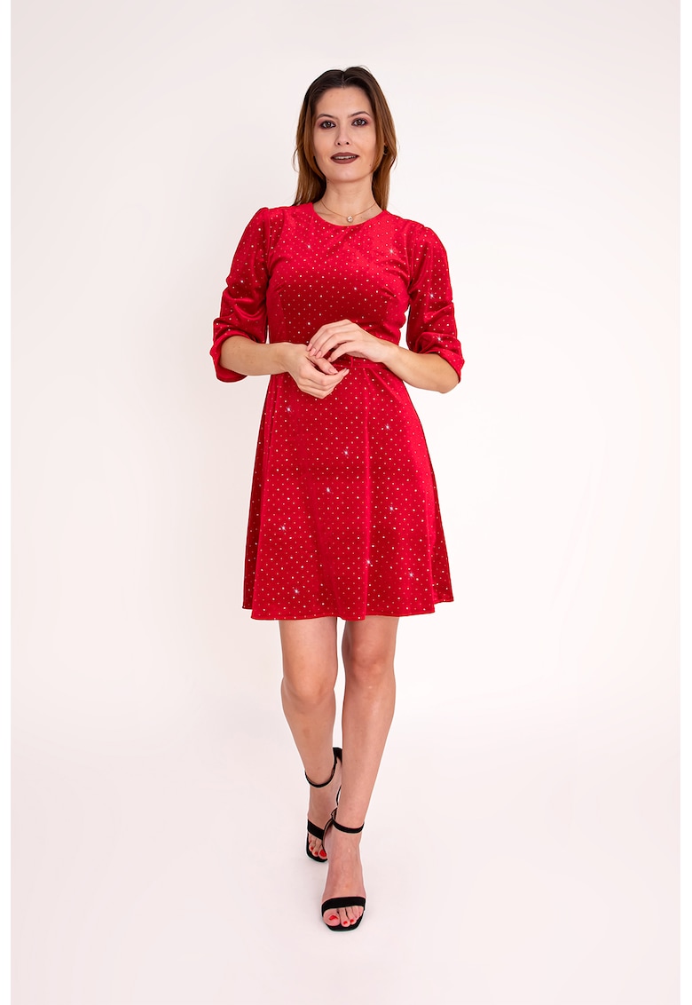 - viscoza Imprimeu: uni Croiala: evazat Lungime: midi Decolteu: rotund Lungime maneca: maneca medie Detalii: aplicatii din strasuri