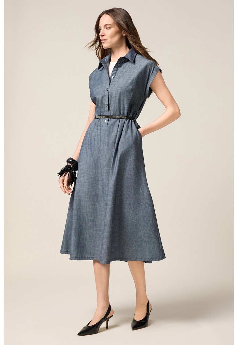 - in Imprimeu: uni Croiala: evazat Lungime: midi Guler: ascutit Lungime maneca: maneca scurta Buzunare: 2 laterale Sistem inchidere: nasturi Compozitie Exterior: 80% bumbac