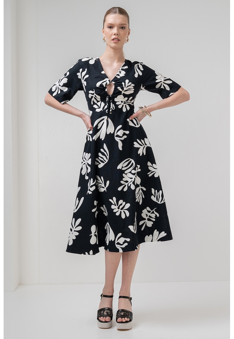 - negru Stil: casual Material: sintetic Imprimeu: floral Croiala: evazat Lungime: midi Decolteu: in v Lungime maneca: maneca scurta Compozitie Exterior: 55% in