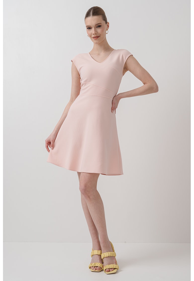 - elastan Imprimeu: uni Croiala: evazat Lungime: scurta Decolteu: in v Lungime maneca: maneca scurta Compozitie Exterior: 95 % poliester 5% elastan Info model Modelul poarta un produs de marimea S. Marimi model: 176 cm inaltime