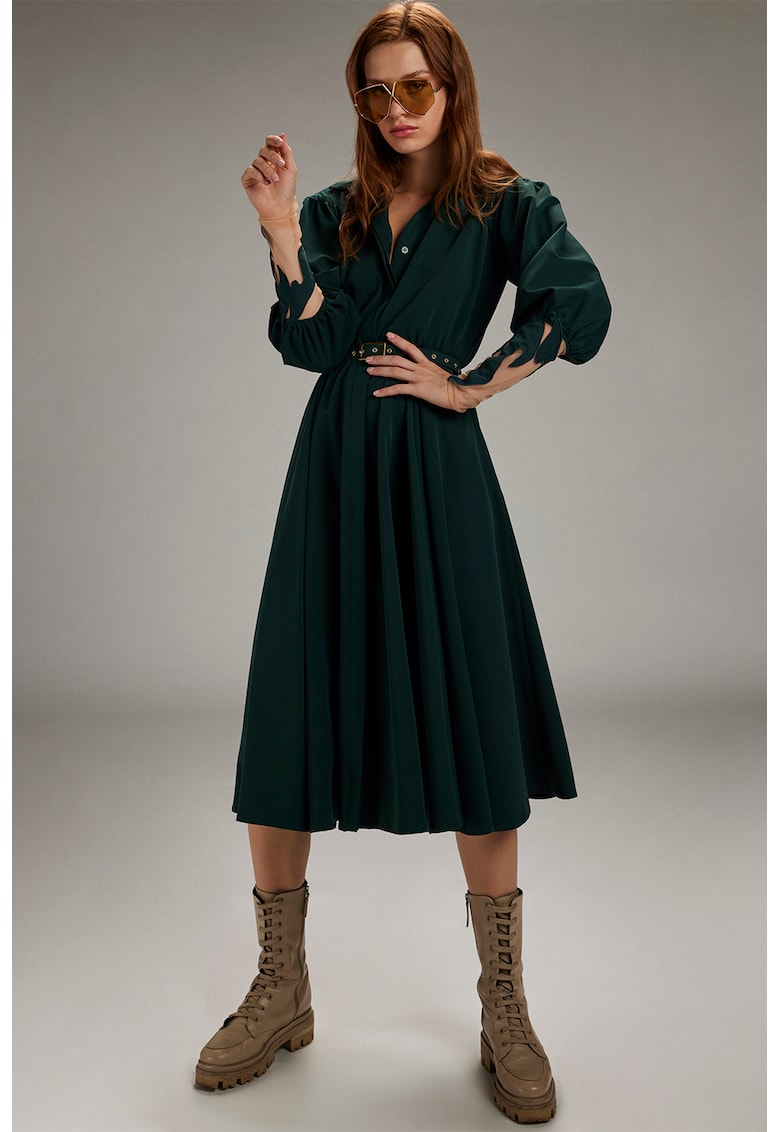 - verde padure Stil: casual Material: poliester Imprimeu: uni Croiala: evazat Lungime: midi Guler: ascutit cu decupaj in v Lungime maneca: maneca lunga Buzunare: buzunare laterale Sistem inchidere: nasturi Compozitie Exterior: 78% poliester