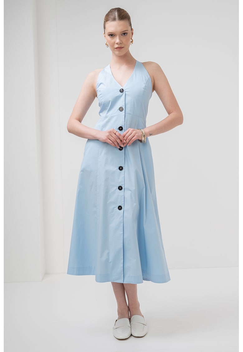 Caracteristici Culoare: albastru pastel Stil: casual Material: bumbac Imprimeu: uni Croiala: evazat Lungime: midi Decolteu: in v Lungime maneca: fara maneca Sistem inchidere: catarama Compozitie Exterior: 98% bumbac