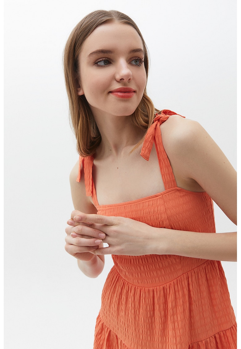 - viscoza Imprimeu: uni Croiala: evazat Lungime: scurta Decolteu: patrat Barete: barete cu prindere pe umeri Lungime maneca: fara maneca Detalii: texturata Sistem inchidere: fara inchidere Compozitie Exterior: 59% viscoza