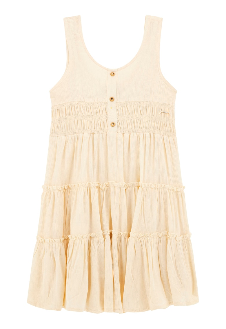 Caracteristici Culoare: galben pal Stil: casual Material: viscoza Imprimeu: uni Croiala: evazat Lungime maneca: fara maneca Stil decolteu: rotund Sistem inchidere: nasturi Detalii: material vaporos