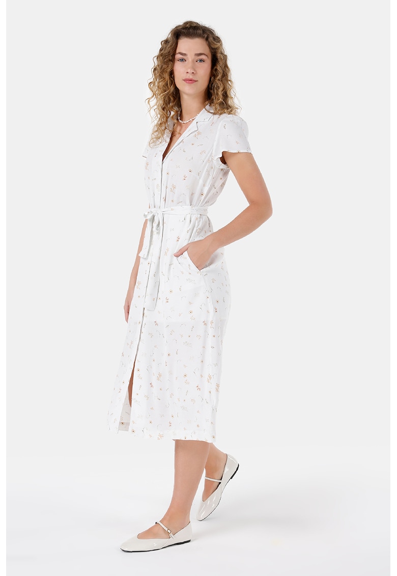 - alb optic Stil: casual Material: viscoza Imprimeu: floral Croiala: evazat Lungime: midi Guler: cu revere decupate Lungime maneca: maneca scurta Buzunare: 2 Detalii: cordon detasabil in talie Sistem inchidere: nasturi Compozitie Exterior: 100% viscoza