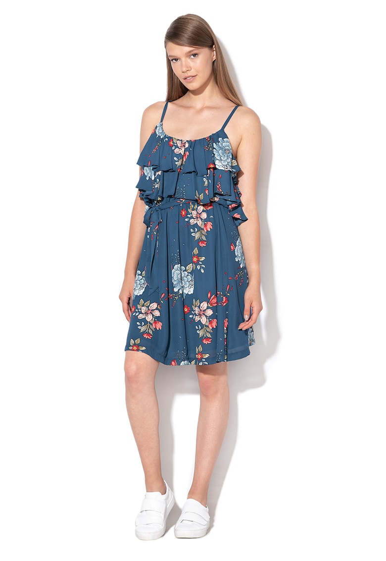 Caracteristici Culoare: bleumarin Stil: casual Material: sintetic Imprimeu: floral Croiala: evazat Lungime: midi Decolteu: rotund Barete: ajustabile Lungime maneca: fara maneca Talie: elastica