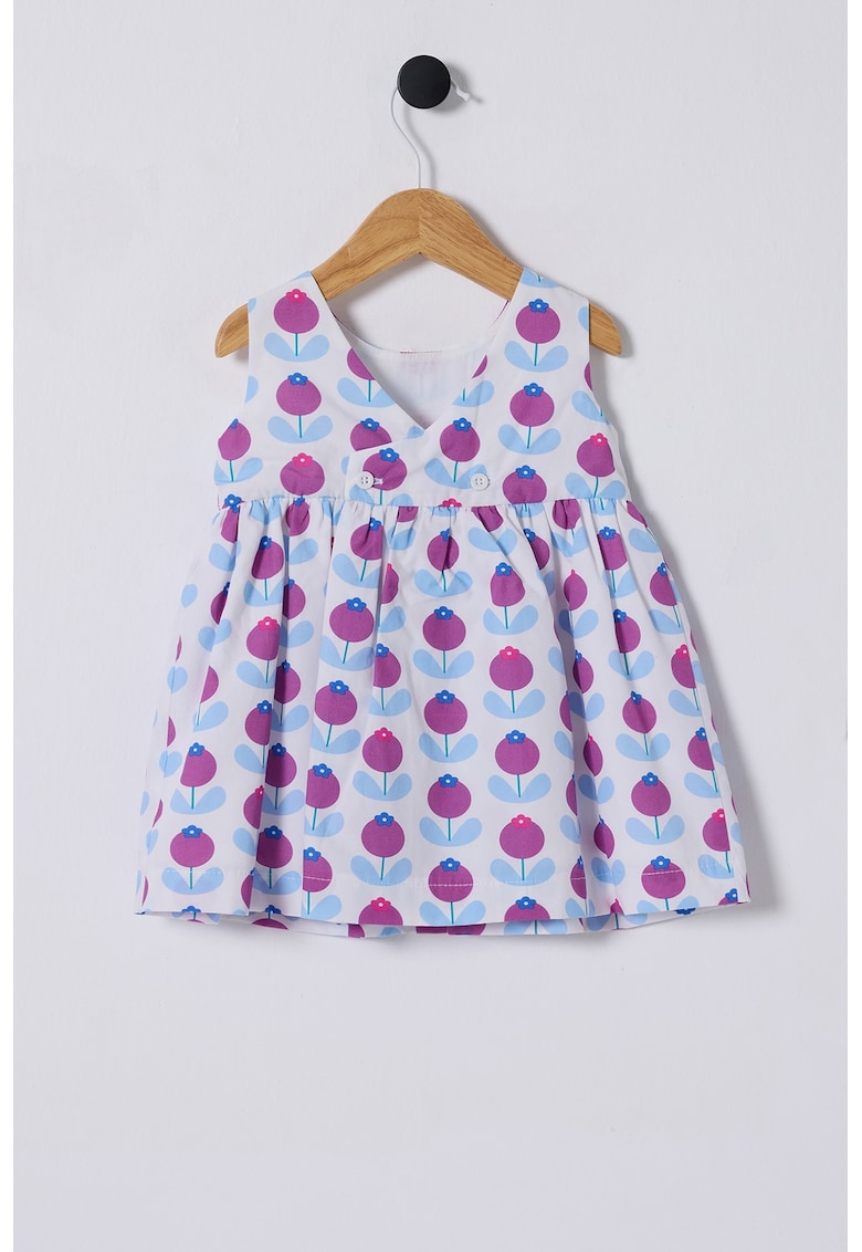 - albastru lavanda Stil: elegant Material: bumbac Imprimeu: floral Croiala: evazat Lungime maneca: fara maneca Stil decolteu: v Sistem inchidere: nasturi Colectie: primavara