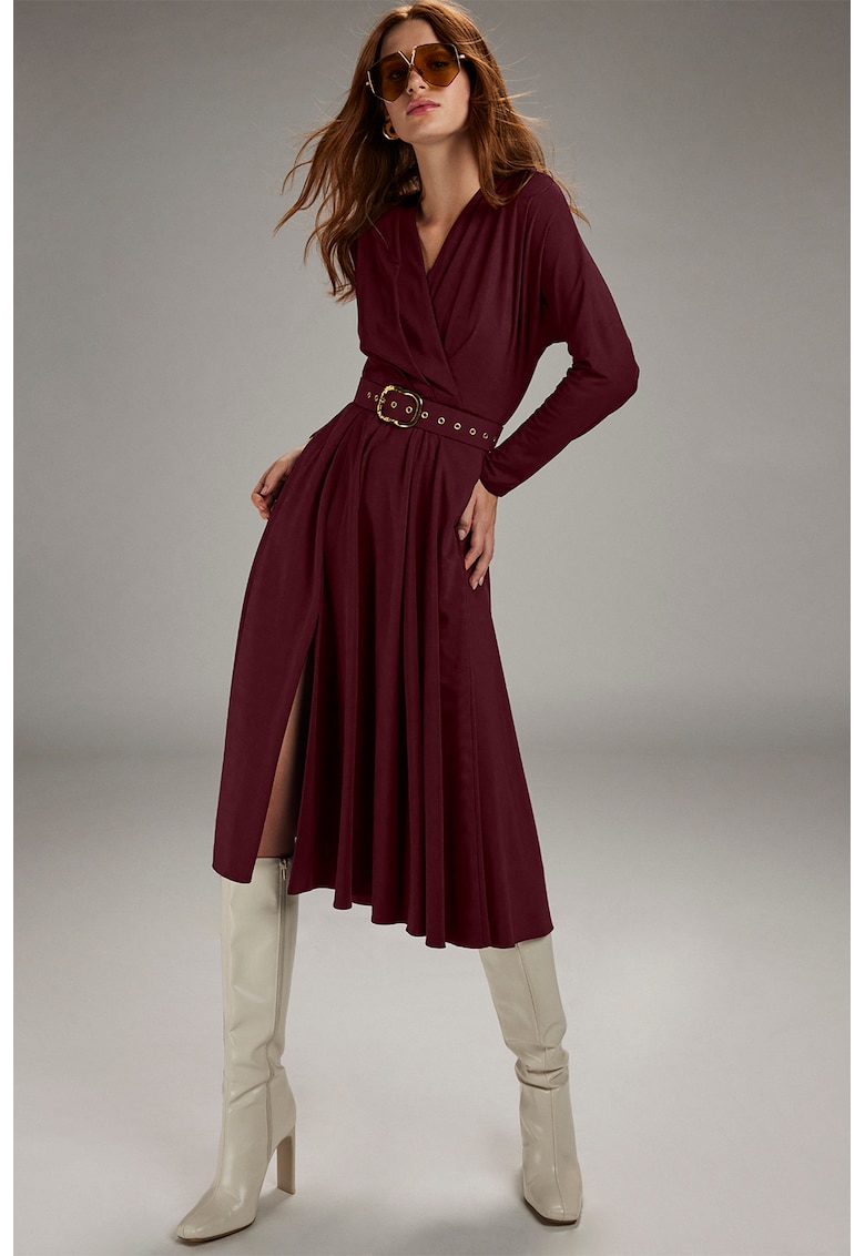 Caracteristici Culoare: visiniu Stil: elegant Material: viscoza Imprimeu: uni Croiala: evazat Lungime: midi Decolteu: in v Lungime maneca: maneca lunga Talie: cu o curea din material textil Detalii: slit pe partea din fata Sistem inchidere: fermoar Compozitie Exterior: 70% viscoza