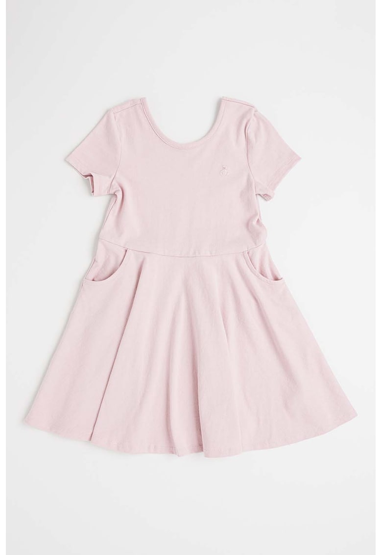 Caracteristici Culoare: roz prafuit Stil: casual Material: bumbac Imprimeu: uni Croiala: evazat Lungime maneca: maneca scurta Stil decolteu: rotund Sistem inchidere: fara inchidere Detalii: buzunare frontale Colectie: primavara