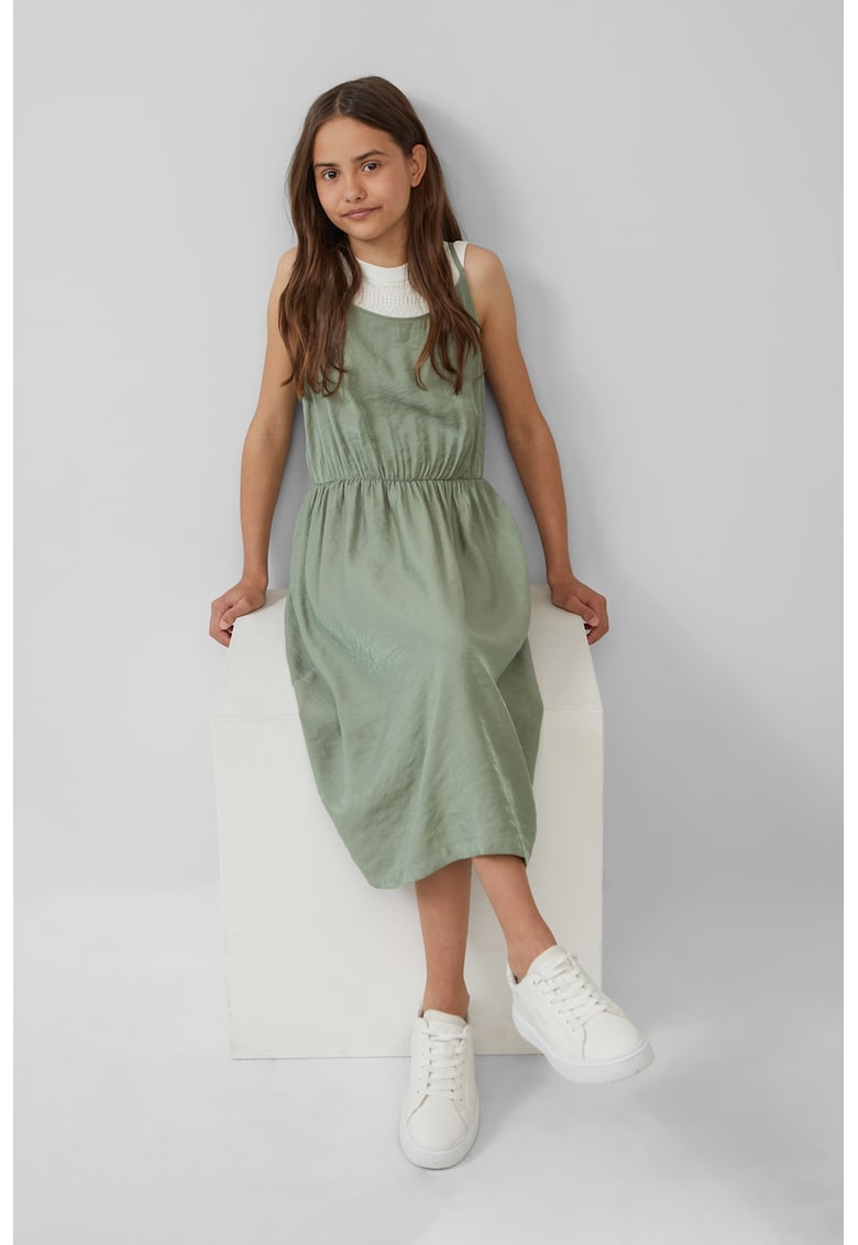Caracteristici Culoare: verde pal Stil: casual Material: sintetic Imprimeu: uni Croiala: evazat Lungime maneca: fara maneca Stil decolteu: rotund Sistem inchidere: fara inchidere Colectie: primavara