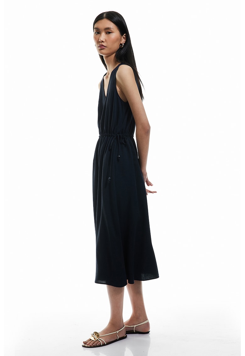 - in Imprimeu: uni Croiala: evazat Lungime: midi Decolteu: in v Lungime maneca: fara maneca Detalii: cordon in talie Sistem inchidere: nasturi Compozitie Exterior: 90% viscoza