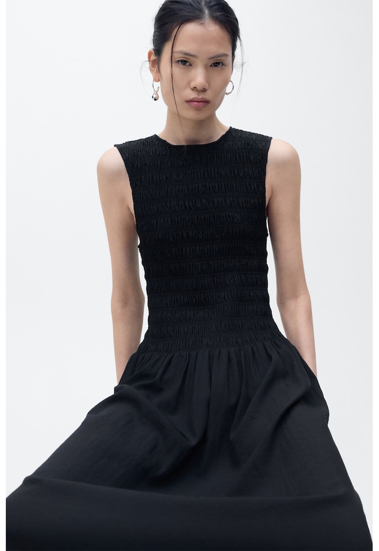 - poliamida Imprimeu: uni Croiala: evazat Lungime: midi Decolteu: la baza gatului Lungime maneca: fara maneca Detalii: nasture pe partea din spate a decolteului Compozitie Exterior: 60% viscoza